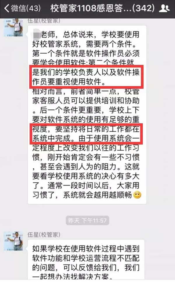 贴一张某校长对校管家实施的推进,他主动将升级重点通知给全校老师,原发于今日凌晨5点,距离校管家通知校长系统升级