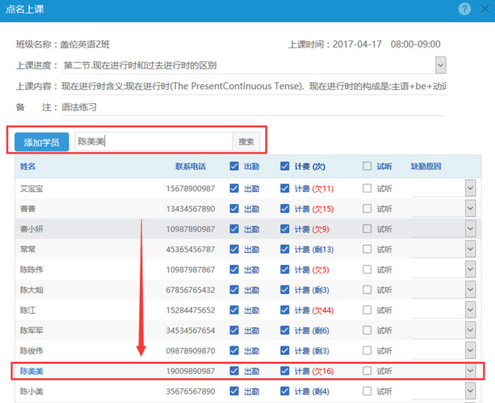 当班级里上课的学员人数较多时,老师在点名时候可以根据学员的姓名快速找到要点名的学员,并对该学员记录考勤。