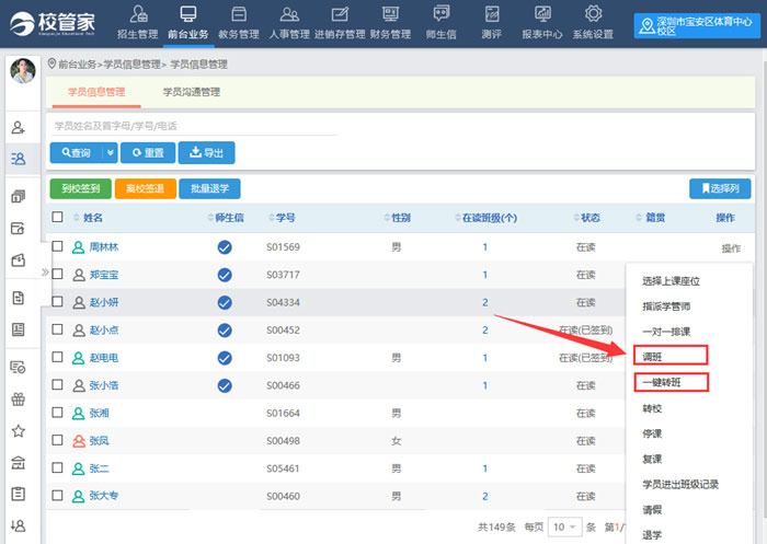 注意:为了方便老师区分这两个功能,将原有的“转班”名字更换为了“调班”。(操作入口:前台业务>学员信息管理>操作>一键转班)