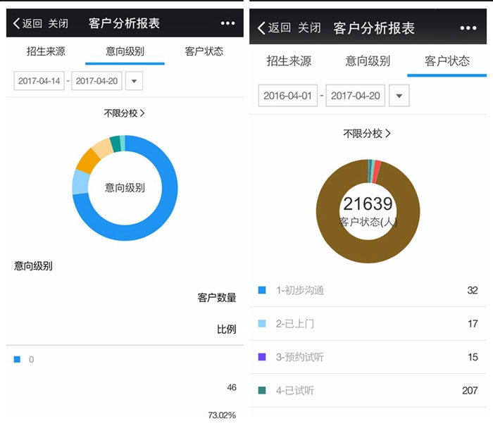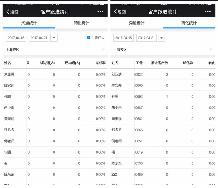 客户跟进统计新增“沟通统计表”和“转化统计表”,让招生数据分析更直观,管理更方便。