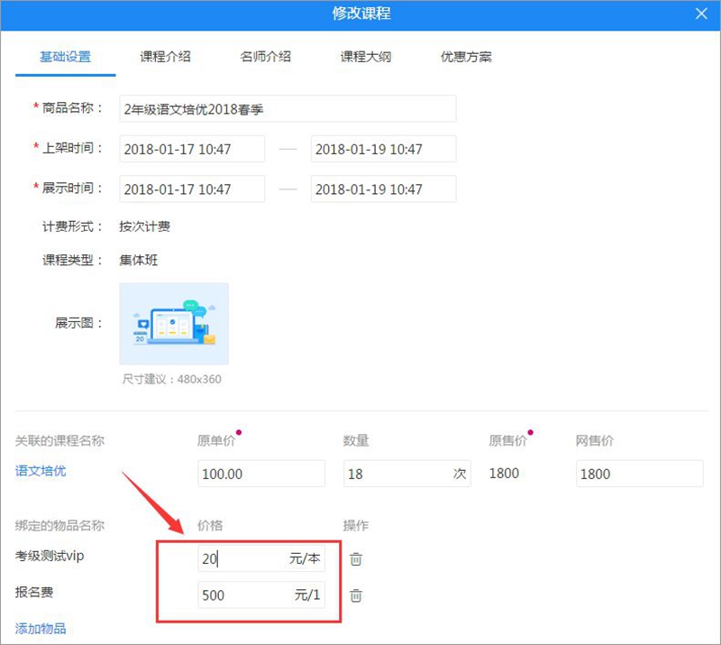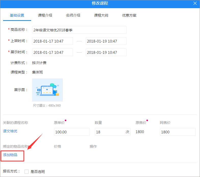 1、修改课程或班级时点击添加物品