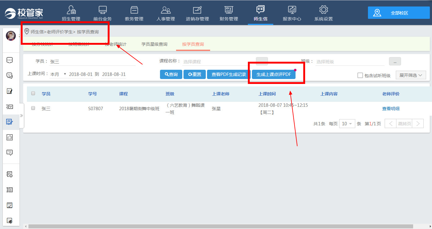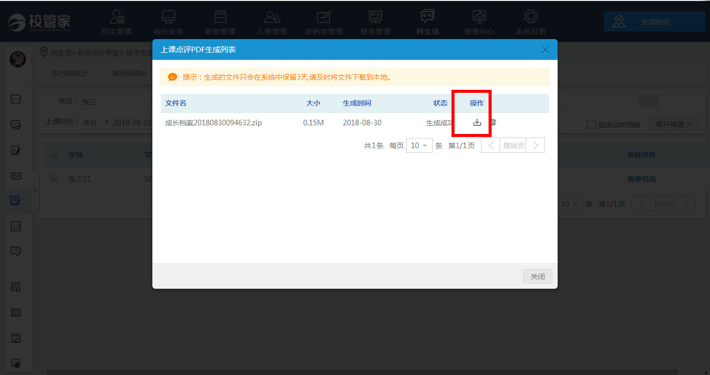 一、学校可以将老师对学员的上课点评批量导出为文件。