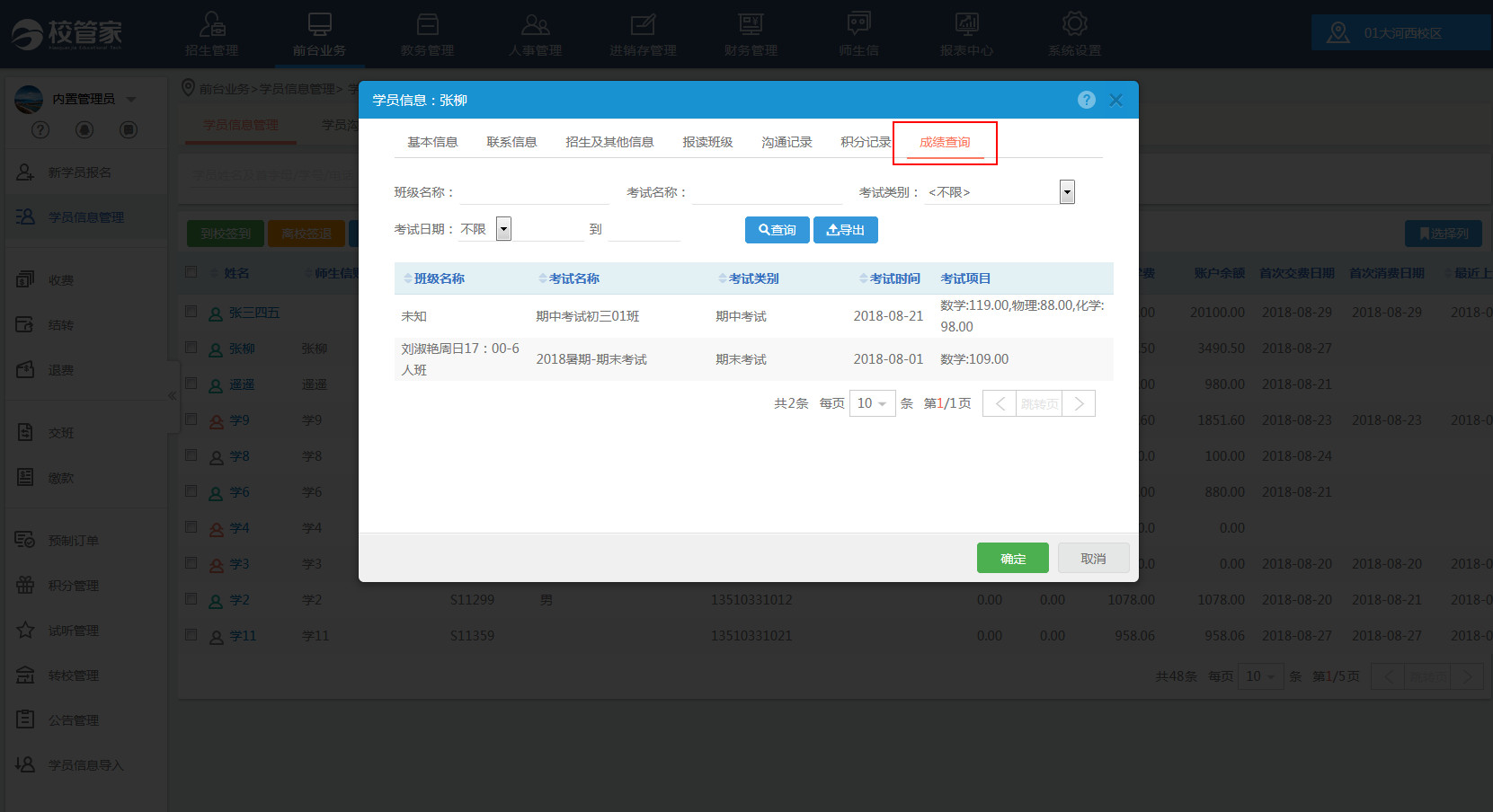 三、学员信息详情页面可以展示学员考试成绩了。
